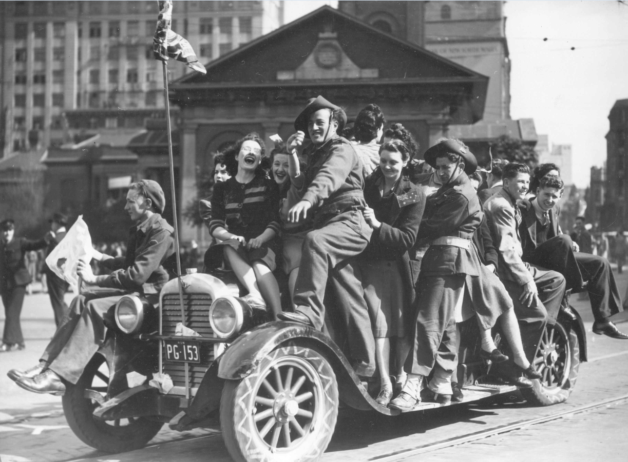 The photograph captures the celebrations in Sydney on 15 August 1945, the day imperial Japan surrendered in World War II. Soldiers and civilians alike, such as those pictured in this photograph, took to the streets of Sydney to celebrate the end of the war.