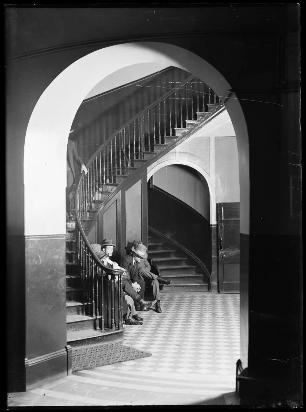 Photograph of men waiting under the staircase in the King Street Court Complex, Sydney, ca. 1930s. The photograph depicts the distinct geometric floor pattern and circular staircase which remain intact and prominent features of the building today.